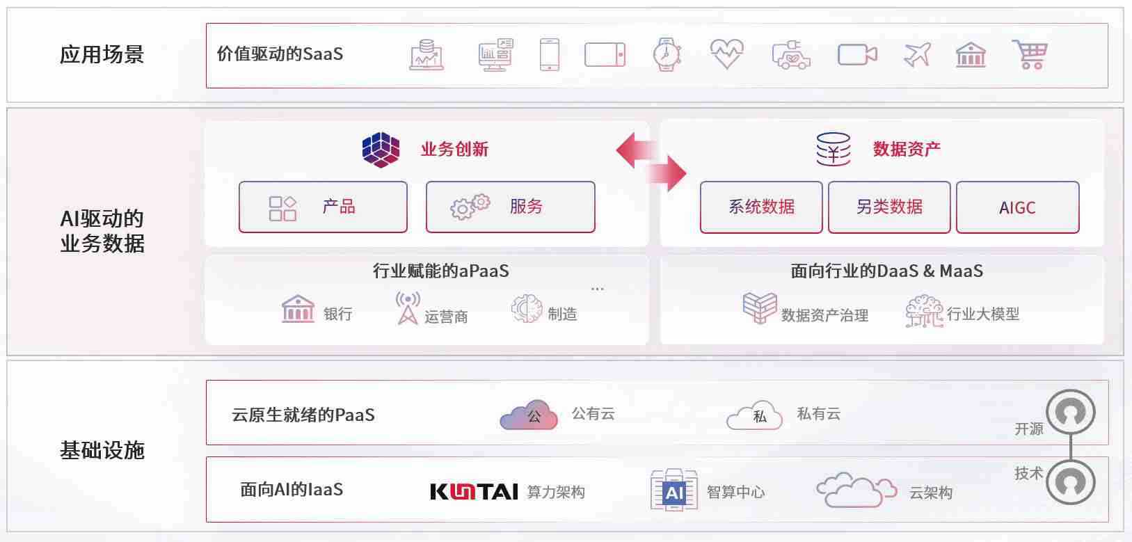 数字时代,,,围绕企业数字化转型的关键要素,,,南宫电子游戏数码开创性的提出数云融合战略和技术体系框架,,,着力在云原生、、、数字原生、、、AI原生和信创产业上架构产品和服务能力,,为处在不同数字化转型阶段的快消零售、、、、汽车、、金融、、医疗、、、政企、、、、教育、、、、运营商等行业客户提供泛在的敏捷IT能力和融合的数据驱动能力,,构建跨界融合创新的数字业务场景和新业务模式,,助力企业级客户建立面向未来的核心能力和竞争优势,,,全面推动社会的数字化、、、、智能化转型升级。。。。